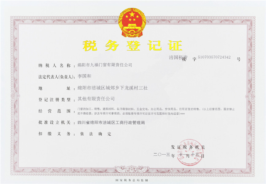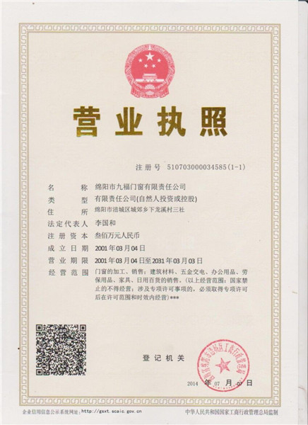綿陽市九福門窗有限責任公司座落于中國西部美麗的科技城----綿陽。是川內研發生產新型換代,生態環保室內門和家具的企業之一。我公司生產的產品,綠色環保、堅固耐磨,抗擊性高、防潮阻燃、不含苯、不變形,連續六年經四川省綿陽市質量技術監督局抽檢合格,符合中華人民共和國行業標準的各項要求。2011年,被中國產品培育委員會和中國品牌調查統計中心推介為《質量·服務·信譽AAA企業》、《中國綠色環保產品》和《誠信經營、消費者滿意產品》;注冊商標“金九福”牌系列產品,在全國品牌評選推廣活動中,經中國品牌認證委員會和中國產品質量評選中心審核,于2012年2月入選為《中國****品牌》…>>更多